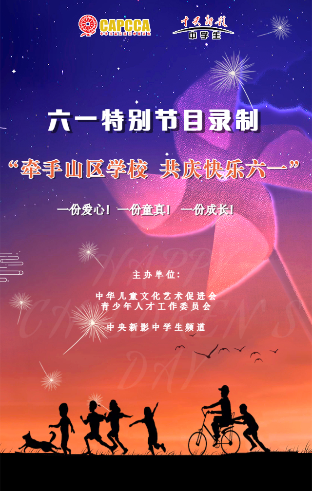 经研究决定,在六一儿童节即将来临之际,由中华儿童文化艺术促进会青少年工作委员会联合中央新影中学生频道组织开展“牵手山区学校 共庆快乐六一”六一特别节目录制活动,具体安排如下: